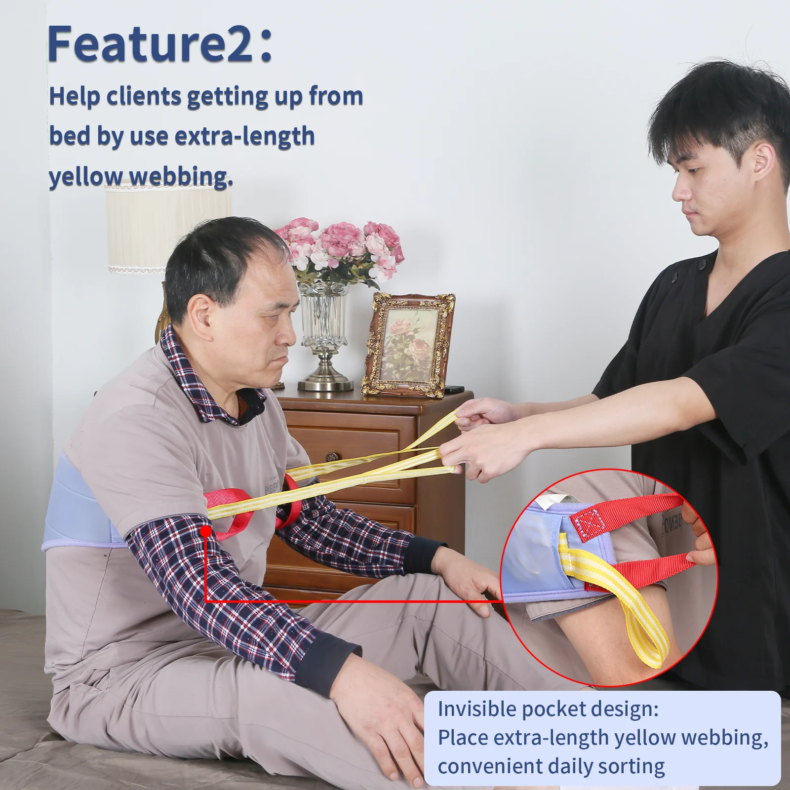 - [Extension straps design]: As an elderly lift assist device, the patient transfer belt, considering bed pull-up assist for the elderly, the yellow 16.5-inch extension strap is designed on both sides of the transfer belt can help patients sit and transfer in bed. Also sewn pockets with extension straps on both sides of the lift belt for elderly adults, convenient for mobility and daily living.