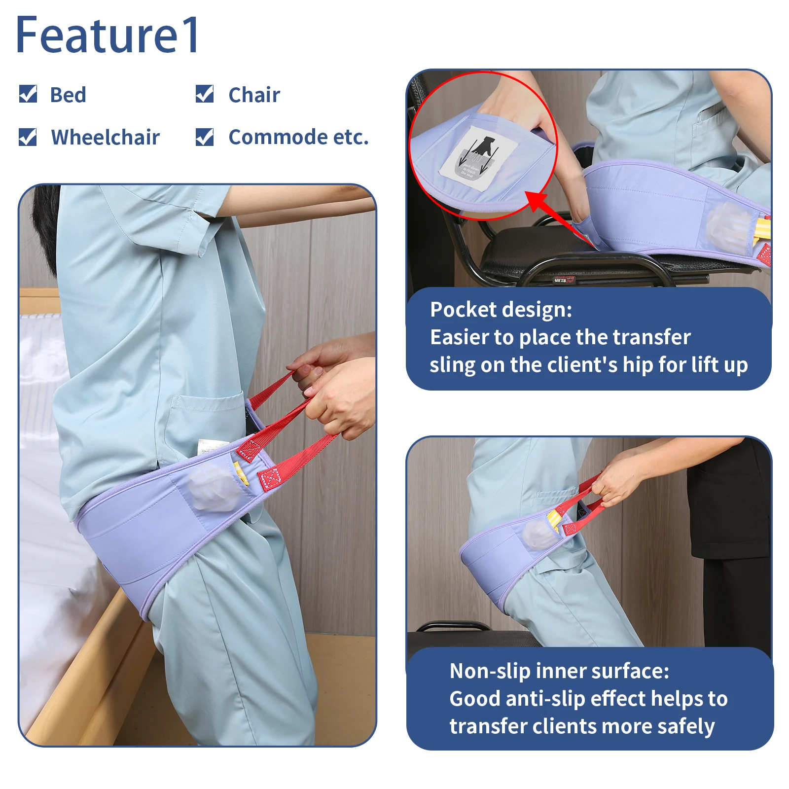 - [Pocket Design]: Unlike other transfer slings, this patient lift sling has a unique pocket design, making the transfer belt for the elderly more convenient for caregivers to insert the transfer belt with handles between the patient and the chair by putting their hands in the pocket. The pocket surface comes with instructions for use; it’s easier to use.