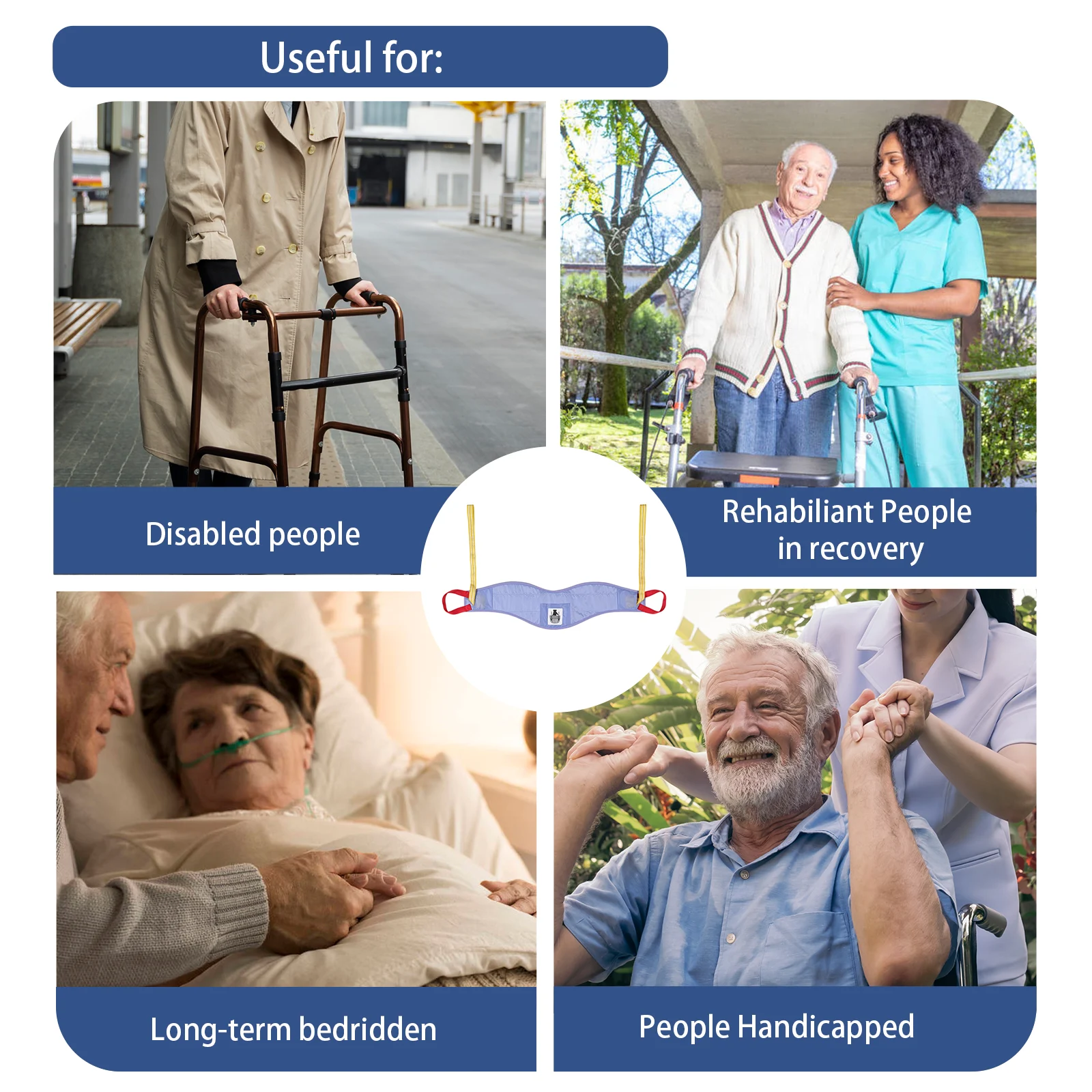 - [Safely assist with transfer]: The transfer sling for the elderly and disabled can help patients with limited mobility or the elderly to move, and the transfer sling assists them in transferring from wheelchairs、chairs, and beds. As a good transfer aid for the disabled, the transfer sling for lifting seniors can greatly reduce the risk of caregiver injuries when transferring patients, and a single person can easily care of the patients.
