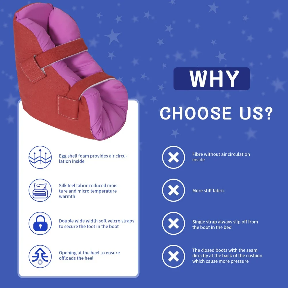 –Special Opening Design’s Ehucon heel cushion pillow: Open ankle outlet design allows the heel is float on air, reducing contact points, helping to relieve pressure and promoting healing of possible pressure sores at the heel.