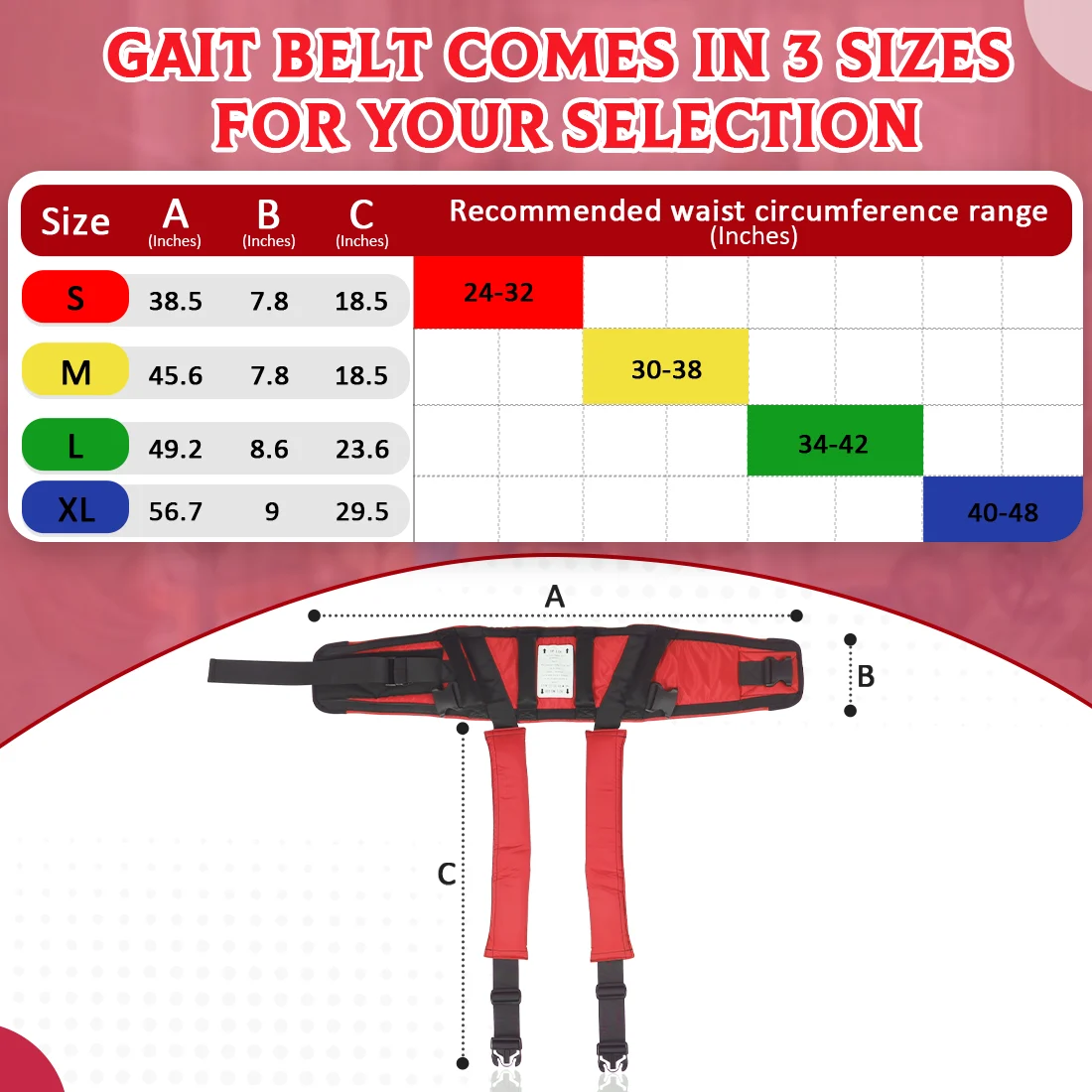 –Gait Belt comes in 3 sizes: The transfer gait belt comes in three sizes: S, M, L, and XL. The red small size fits waist measurements of 24-32 inches, the yellow medium size fits waist measurements of 30-38 inches, the green large size fits waist measurements of 34-42 inches, and the blue extra large size fits waist measurements of 40-48 inches. Please measure the user’s waist to choose the appropriate gait belt size.