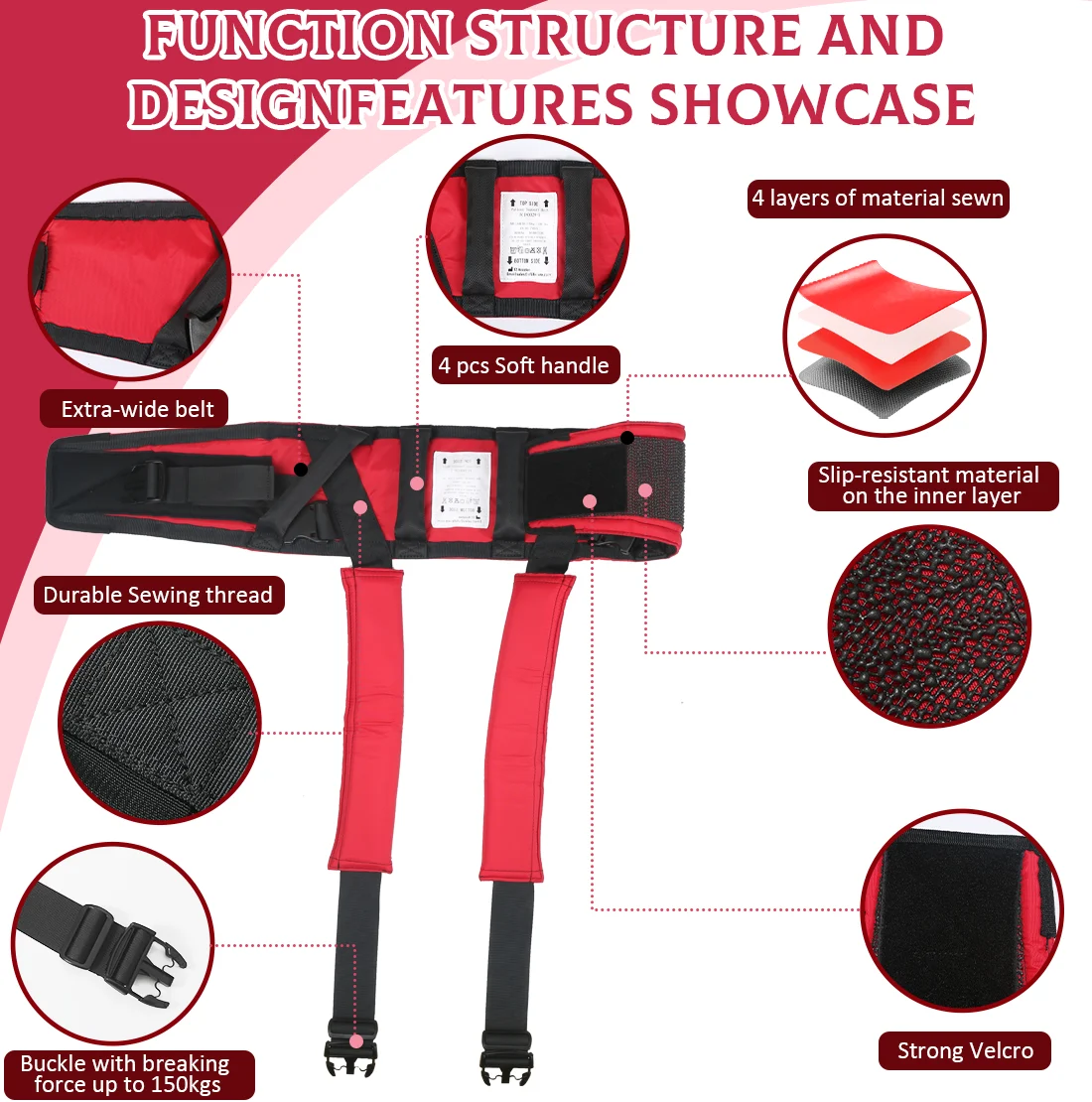 –Double-layered safety protection design: The patient transfer belt employs strong adhesive hook and loop fasteners and a buckle with a breaking strength of 150 kg for dual-lock safety protection, ensuring secure usage. The safety working load of the gait belt with handles is 330 pounds (150 kg); please ensure not to exceed this weight limit.